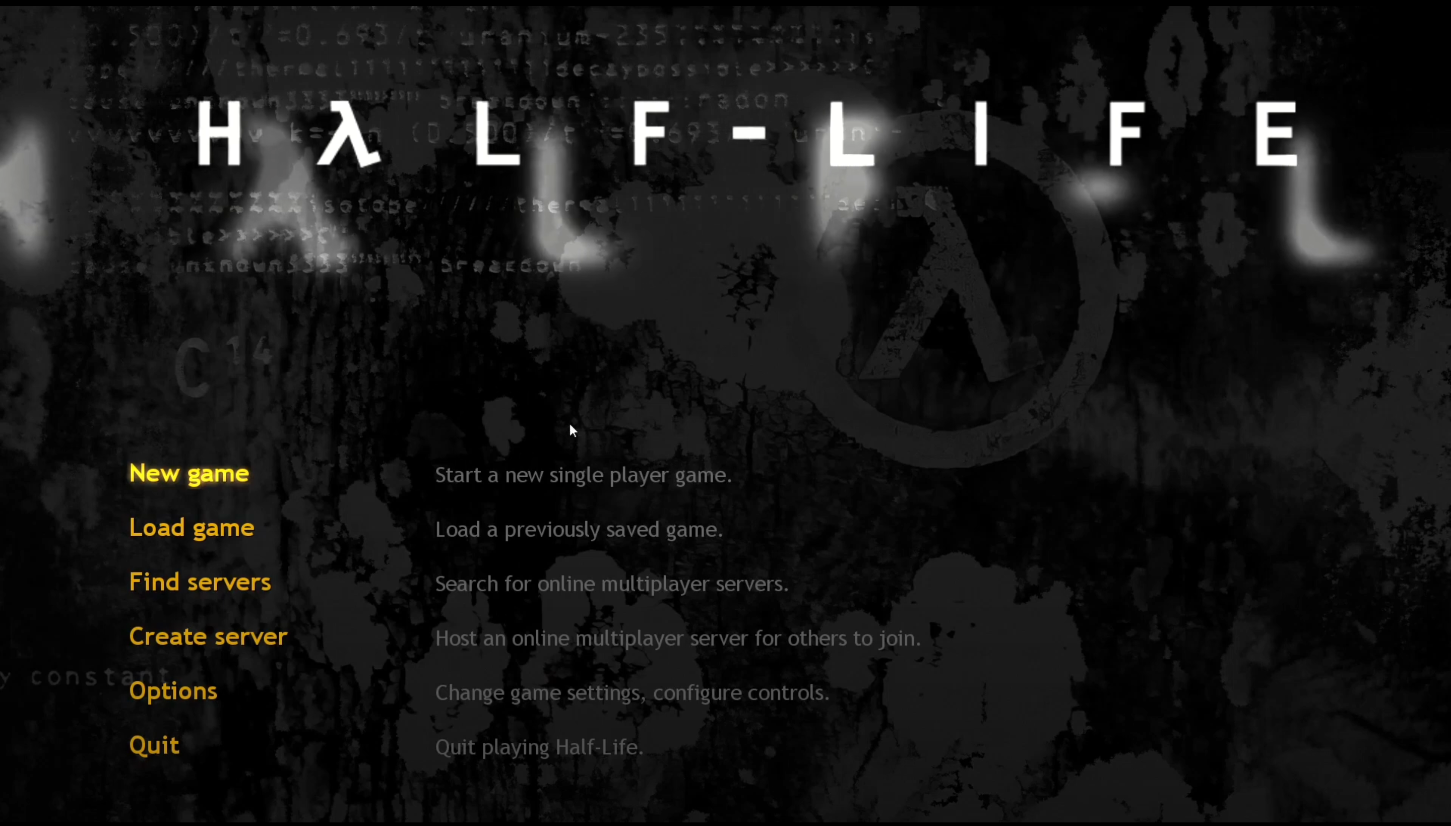 먼저 하프라이프입니다. 25주년 업데이트 기반으로, 타이틀 화면부터 살펴보도록 하겠습니다. 과거의 밸브 게임이 그러하듯이, 깔끔한 인터페이스를 사용합니다.