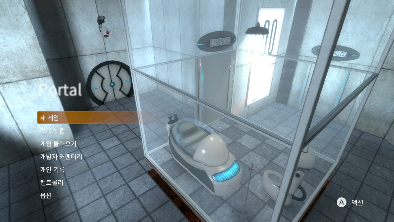 포탈 2의 타이틀 화면입니다. 최신 게임 스타일이라고 할 수 있는 깔끔하면서도 정보를 기존보다 잘 표시해주는 UI입니다. 역시 닌텐도 스위치 버전으로, PC 버전에서는 실험실을 만들 수 있는 기능도 있습니다.