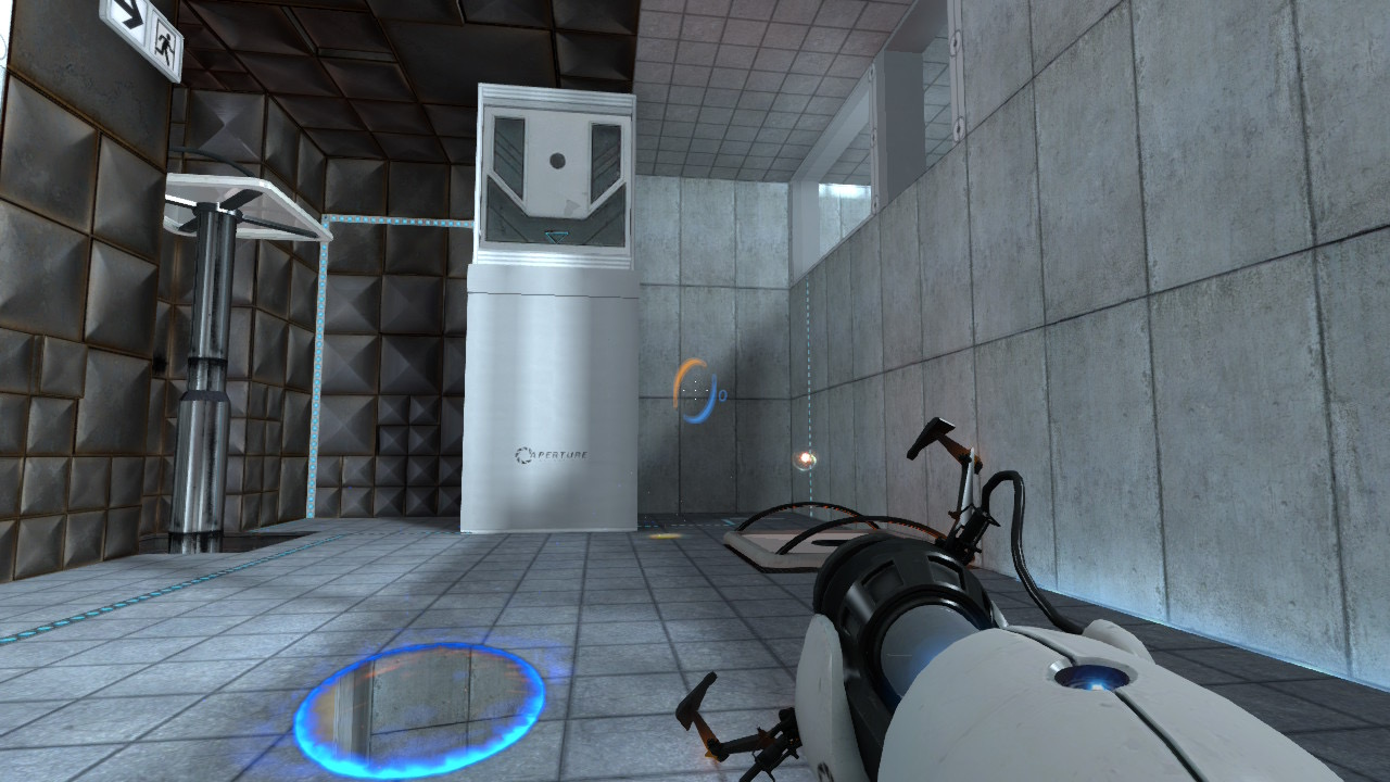 포탈 2의 인게임 화면입니다. 여기서 다룬 게임들 중 가장 진보된 그래픽을 가졌으며, 역시 비슷하게 미니멀리즘한 UI를 가지고 있습니다. 포탈 2에서는 중앙의 원이 해당하는 색깔의 포탈을 사용 중임을 나타내고, 포탈건의 마지막 쏜 색깔을 나타내는 빛이 더 밝아졌습니다.